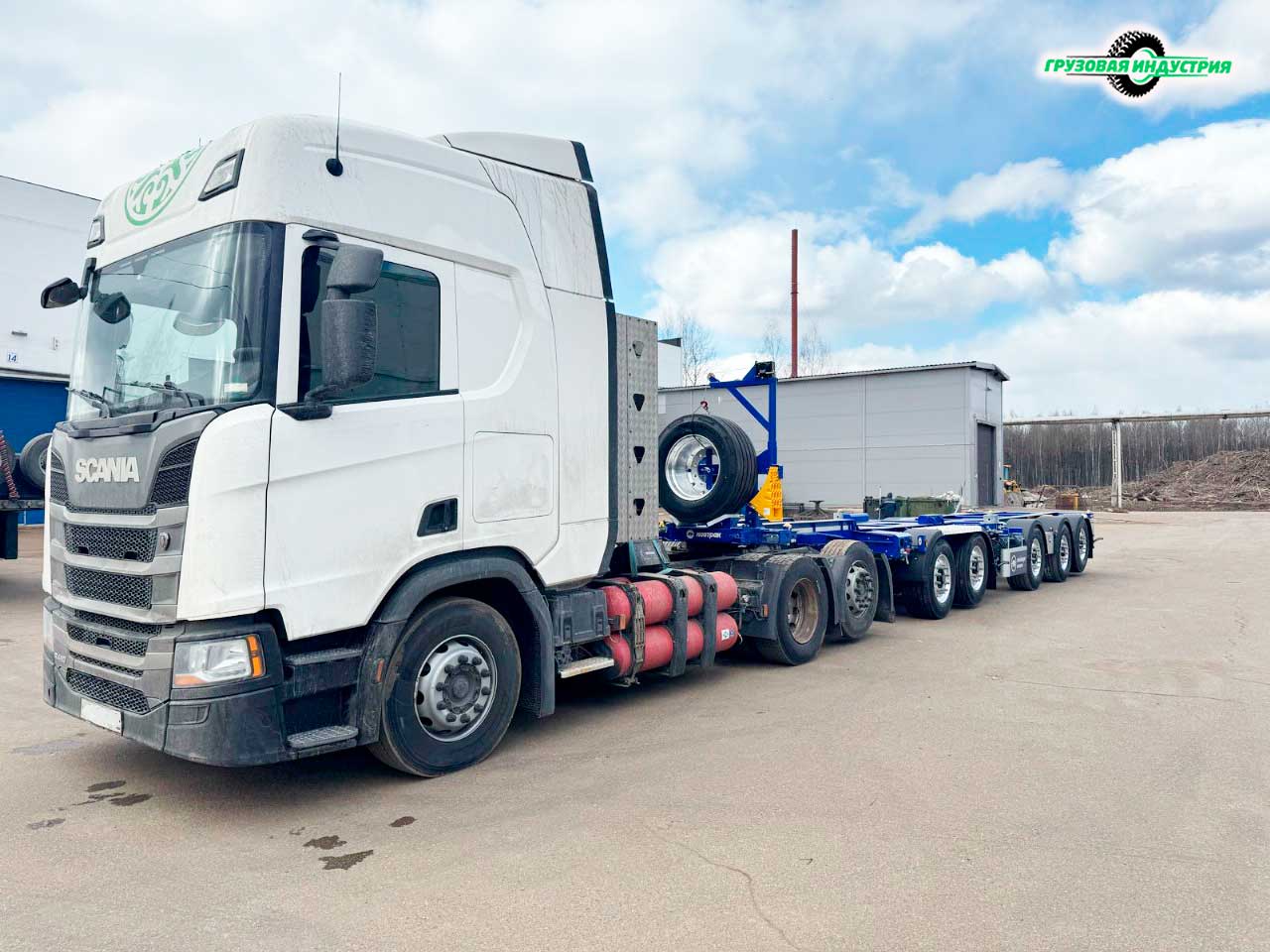 Отгрузка сцепки: тягач Scania и универсального полуприцепа тандемного контейнеровоза Meusburger Новтрак SW-570 в Ростов на Дону.